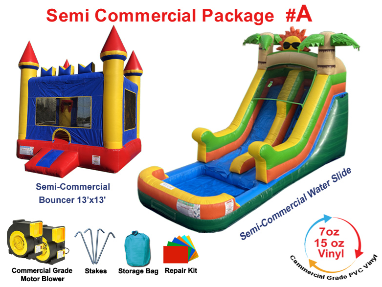 This package includes the 13x13 Semi-Commercial Bounce House and the Semi-Commercial Waterslide. The top sections, windows, and pillars are made from 7oz lightweight PVC vinyl, while stress points are reinforced with multiple layers of vinyl and feature double and quadruple stitching for added durability. The package also comes with two commercial-grade motor blowers, stakes, storage bags, and repair kits.